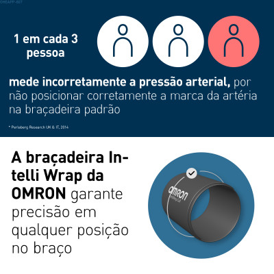 Está equipado com o manguito Intelli Wrap (22–42 cm), que proporciona medições precisas independentemente da posição no braço. Isto ajuda a eliminar erros comuns provocados por uma colocação incorreta do manguito, sendo especialmente adequado para utilizadores iniciantes.